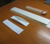 шириной 25мм.Взял осноование длиной 100мм.3-ий лежит сама загтовка лыж,из сендвич панеля.У него для наглядности еще не загнут и не приклеен нос.Шириной 45 мм,длина260мм.Нос потолочкой проклеил,затем резинкой конторской затянул,как пказано на хвостовом лыже.Хвостовая размером120мм на 30 мм.После высыхания для прочности нос еще наплавил термопистолетом.Затем деталь 2 из короба приклеил клеем момент секундным на деталь 3.