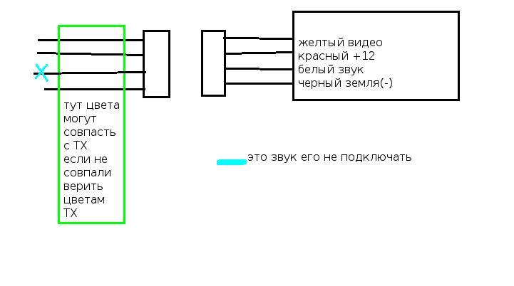блин опять нето дайте фото разъема на видеопередатчике, ответного разъема который в него втыкается на одной фотке, или рискните и считайте что с передатчкиа выходят провода красный +12, желтый видео, белый аудио, черный земля. цвета не на разъеме который втыкается в видеопередатчик а именно провода который из коробочки передатчика выходят.