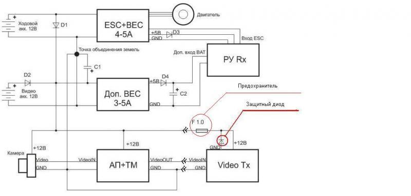 Ну, это должно очень сильно “повезти”. Хотя да, если умрет D1 или D2 в пробой, то веселья не оберешься! И наличие защитного диода уже будет не стольважно, если передатчик сгорит физически, а не электрически. Кстати, вес диода, легко обеспечивающего сгорание 1 амперного предохранителя (по схеме), без опасности выгорания самому, тоже не радует. Просто я летаю с надеждой. Забираюсь визуально километр на Бикслере с надеждой, что вернется. Отхожу 2 КМ от “дома” взлетаю без FPV, и еду в точку “дома” на машине с надеждой, что автопилот его приведет. Так и здесь, ставим диод с надежной, что ряд обстоятельств не сойдется в одной точке в одно время. А если отбросить такую вероятность, или все 5 диодов поставить, что-то типа КД202, то нормальная такая схема.