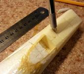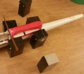 Для того, чтобы сточить хвостик в правильной плоскости пришлось немного поиздеваться на самолётом. Проделал спицей дырочку насквозь в точке позади выреза под крыло, лежащей на одной линии с точкой лобика профиля. Потом уложил на опоры из старых аккумов от упсов.