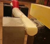 Для того, чтобы сточить хвостик в правильной плоскости пришлось немного поиздеваться на самолётом. Проделал спицей дырочку насквозь в точке позади выреза под крыло, лежащей на одной линии с точкой лобика профиля. Потом уложил на опоры из старых аккумов от упсов.