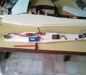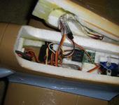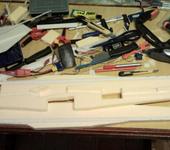 Строительство понемногу продолжается: доклеил усиление фюзеляжа под крылья и шасси, укрепил крылья, вставил сервоприводы. Шасси сделал по-простому из кусков ЭПП и 1.5 мм проволоки. Получилось хлипковато. Видимо, придется переделывать из 2мм. Начинаю обклеивать скотчем.