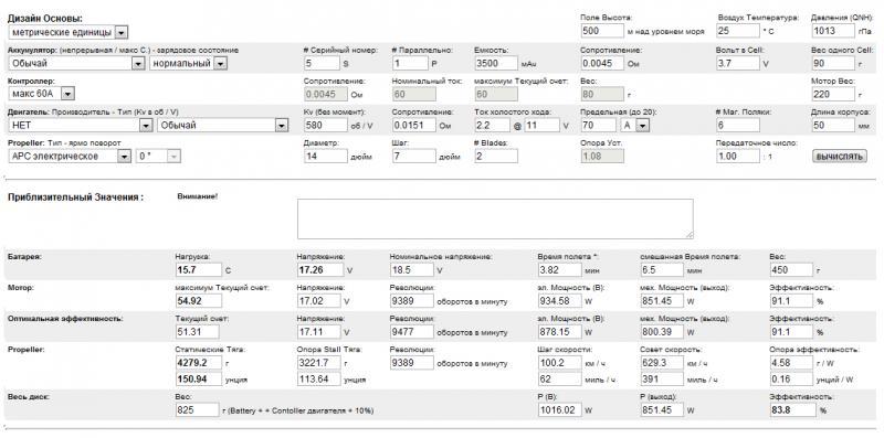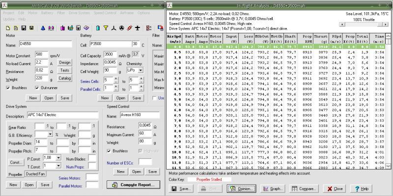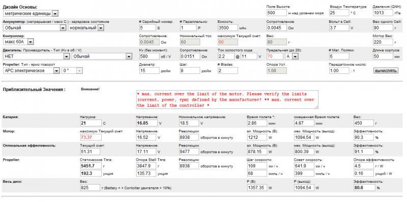 вчера прочитал статью Collapse про электрические силовые установки и решил попробовать смоделировать в motocalce свою вмг. и получил интересные результаты. тяга от 3.8 до 4,2кг. также нашел онлайн версию и она выдала, что с рекомендованным винтом 15х8 превышается допустимый ток, а вот с 14х7 все нормально и тяга тоже больше, чем написано в описании мотора. скриншоты прилагаю.