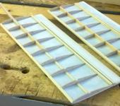 Для крыла вырезаем панели из потолочки, размечаем положение кромок, лонжеронов и нервюр. Полки лонжеронов из сосны сечением 6х2 мм, передняя кромка треугольного сечения 4х4 мм, задняя кромка (под элерон) из 2-х реек 6х2. Пазы под шарниры элерона пропиливаются в рейках перед склеиванием. Между полками лонжерона вклеен пенопласт, чтобы связать полки между собой для устойчивости (фото 2).