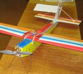 Проектировался самолёт совершенно «от фонаря», оказался удачным ,теперь это почти «клубная модель» для начинающих. Специально вес не экономится, тем не менее все самолёты в пределах от 550 до 700 граммов. По сравнению с Вашим, фюзеляж упрощен до предела , отсюда экономия веса. Обратите внимание на крепление приёмника – липовая дощечка поперёк фюзеляжа, приёмник привязан кольцом из резины.