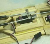 Так как нагрузка на крыло довольно большая, для уменьшения посадочной скорости задействовали элероны как флапероны. Как это устроено, показано на втором фото. Машинка элеронов установлена на подвижной площадке - слайдере. Площадку двигает вторая машинка. Получился механический микшер, чтобы можно было использовать простую некомпьютерную аппаратуру.