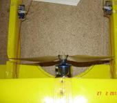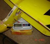 Усиление стоит только в хвостовых балках по одному бамбуковому шампуру, карбон чего то жалко. И еще усиление по низу фюза тонкая фанера, выгнутая по форме, как лыжа. Спереди на фюзеляже видно приклеенные щечки в данном случае из пеноплекса, хотя делал на других и из потолочки, из осаженной на болван бутылки. У всех вариантов свои минусы и плюсы. Но мы говорим про данный вариант. Так вот в этих щечках выбрано с одной стороны под приемник, а с другой стороны под батарейку, так называемые карманы. Сделаны под углом вниз и батарейка входит плотно дополнительной фиксации не требует. По поводу винта лучшие показания были из того что было в наличии 8"x 6 APC но и на 7 летает неплохо только резвости нет, но для обучения самое то.