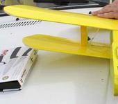 Прорезал элероны на верхнем крыле (задняя кромка крыла была собрана на двустророннем скотче, петли не понадобились), подключил по девятиграмовой серве на каждый элерон. Сервы подключил параллельно и повесил их на первый канал. РН перевесил на четвертый. Элероны небольшие, размером с руль высоты. Сервы прилепил на двусторонний скотч на нижнюю поверхность крыла.
