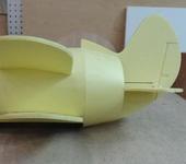 Проще сначала отмакетировать. Вырезал фюз. из пеностирена 30 мм с расчётом иметь посадочное место для мотоблока с EDF 55 mm. Обечайку цилиндрической формы выгнул из 3 мм депрона. EDF получился утопленным внутрь ф. Наверное воздухозаборник не понадобится. Окно в ф. достаточно просторное и сможет обеспечить необходимое количество рабочего тела из набегающего потока. В крайнем случае можно будет добавить пару полуцилиндрических направляющих по бокам, не сильно выступающих наружу.