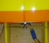 армированным скотчем (наклеен крестом) усилена верхняя поверхность крыла, крепление крыла к фьюзу, крепление моторамы к фьюзу. Даже если дощечка моторамы отклеится, мотор не отвалится.
