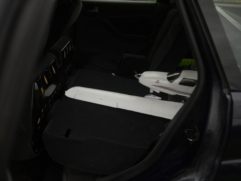 Т.к. в полностью собранном виде самолет может поместиться в машину только при разложении всех сидений, то такой вариант не подходит, т.к. нас 3-е.