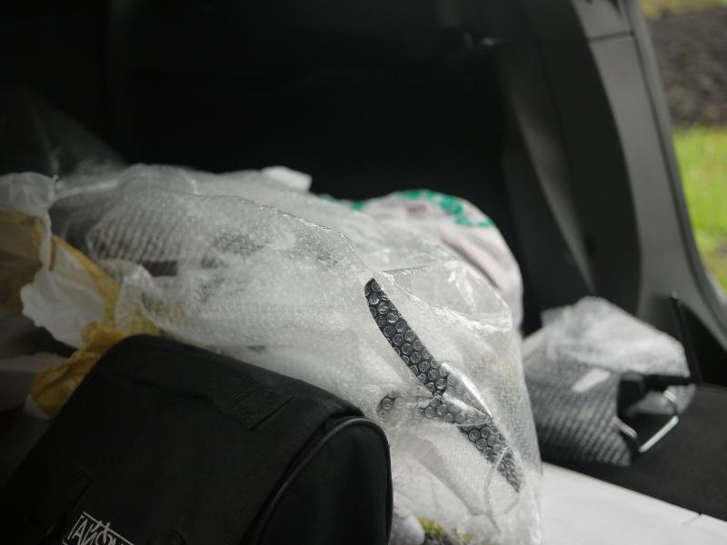 Т.к. в полностью собранном виде самолет может поместиться в машину только при разложении всех сидений, то такой вариант не подходит, т.к. нас 3-е.