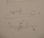 Павел, попробую прояснить, как я понимаю о выкосах. Выкос вниз, это больше относится к верхнепланам. Рис 1 выкоса нет, центр масс самолета находится выше вектора тяги. Образуется вращающий момент с плечом L, который и задирает нос самолета. Рис 2 выкос вниз. Плечо момента уменьшилось, а то и вовсе исчезло. Самолет не задирается. Рис 3 центр масс находится ниже вектора тяги. Самолет стремится опустить нос. Делается соответствующий выкос, дабы уменьшить плечо момента опрокидывания L. Этих выкосов может и не быть. Тогда соответствующее триммирование. Микширование Газ-РВ. Я до таких тонкостей еще не дорос. Рис 4. Смотрим с носа. Винт против часовой соответственно ответная реакция, самолет стремится крениться по часовой. Но в то же время поток от винта в виде закрученного вихря опять же воздействует на плоскости F1 F2 и на РН F3 и в какой то степени ослабляют крен от реакции винта. Поэтому чаще всего и советуют выкос вправо подбирать уж по полету. Бывает еще этот крен парируют круткой консолей. При моем небольшом опыте полетов на пилотажках, там выкосов вниз нет, только вправо. Вот в этом самике небольшой выкос и он на взлете ныряет вниз. И надо приноровится, что бы взлететь