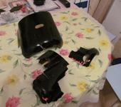 Поднимем ка тему. Сегодня хочу поговорить о ремонте капота. Как приятно держать в руках капот, только что купленной модели. Он так блестит и играет лаком. Просто влюбляешься в него. Но при неудачных посадках это одна из самых уязвимых деталей. Знаю случай когда парень выбросил модель, вполне ремонтнопригодную, так как капот был даже не порван, а замят и покоцан об асфальт. Итак модель упала. Что то типа. Больше похоже на развертку этого капота. Но не падаем духом. Итак в руках куски, причем не все. Космофен, циакрин, суперклей. Кому как нравится.