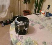 берем подходящую стеклянную банку и бутылку пластиковую. Обжимаем над горелкой. Потом молотком разбиваем банку, если так не снять