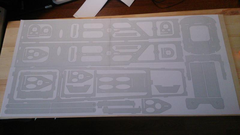 Вообще, стоит сказать, что меня этот самый процесс наклеивания сначала поставил в тупик. Ведь чертеж выводится на отдельные листы бумаги и длинномерные детали перекрывают сразу 2-3 листа. Как приклеить их ровно… После некоторых размышлений, я распечатал ещё один комплект чертежей на цельном листе прозрачной плёнки и буду использовать её для выравнивания чертежей. Правда тут вылез один момент, состоящий в том, что разные устройства по разному протягивают бумагу и поэтому их длина, хоть и на доли миллиметра, но отличается. Но, надеюсь, это не критично…
