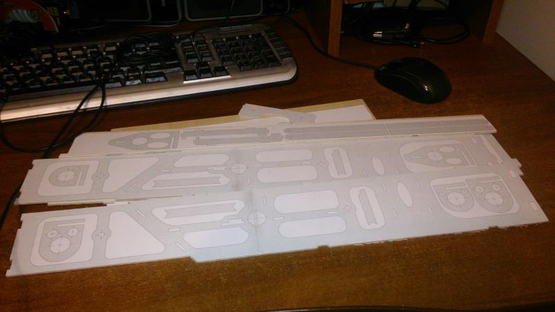 Вообще, стоит сказать, что меня этот самый процесс наклеивания сначала поставил в тупик. Ведь чертеж выводится на отдельные листы бумаги и длинномерные детали перекрывают сразу 2-3 листа. Как приклеить их ровно… После некоторых размышлений, я распечатал ещё один комплект чертежей на цельном листе прозрачной плёнки и буду использовать её для выравнивания чертежей. Правда тут вылез один момент, состоящий в том, что разные устройства по разному протягивают бумагу и поэтому их длина, хоть и на доли миллиметра, но отличается. Но, надеюсь, это не критично…