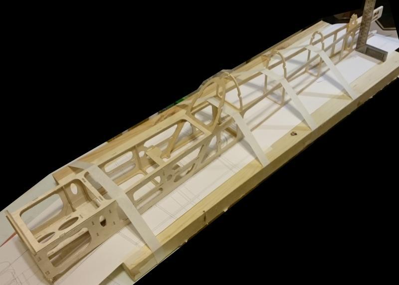 И… И итог меня, если честно, порадовал. Я не был уверен, что всё высохнет так ровно… Я прежде чем клеить сложил все четыре стрингера вместе и напильником выровнял все посадочные места для шпангоутов. Без этого действия у меня выгибало хвост в сторону. Ну а теперь низ ложится точно по чертежу, а хвост по уголку тоже перпендикулярен доске. В общем, пока всё идёт хорошо. С фиксатором крыльев решил выпилить ещё один комплект и сточить до нужной толщины, благо у меня есть подходящая для этого приблуда для дремеля…