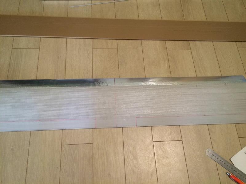 Размах на ширину листа, минус на срез 2-х кромок - 1160мм. На крыло, впрочем как и на все рулевые поверхности была наклеена строительная серпянка на клей ТИТАН. Придало достаточной жесткости. Под крылом в середине наклеена линейка деревянная, но не для прочности, а для крепления серв (не хотелось мне сервы в крыло монтировать). Плюс вдоль линейки идут провода от серв в фюзеляж.