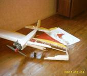 Недостаток опыта… До этого летал только на тренере электричке. Первый полетный день, проблемы с системой питания, три коротких полета оканчивавшихся заглоханием двигателя. Собрался, поехал домой, починил систему питания… Время - пора бы и успокоиться, перенести испытания на завтра, но нет 😦 , не угомонился… Полет в районе 23.00 часов, сумерки… Не сбросил вовремя газ, отпустил далеко, потерял ориентацию, в результате морковка метров с 50… Сутки поиска, с применением даже конных сил, так-как трава(точнее бурьян) в районе аэродрома была более метра… И вот результат - все что от него осталось… Восстанавливать не стал, купил новый, точно такой же планер, благо он не дорогой, и все переставил на него…