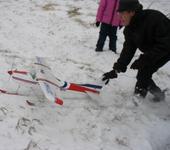 Передняя стойка зарывается в рыхлый снег при увеличении оборотов двигателя - наверное сказывается выкос. А с такой тяговооружённостью, думаю, можно взлетать с рук.