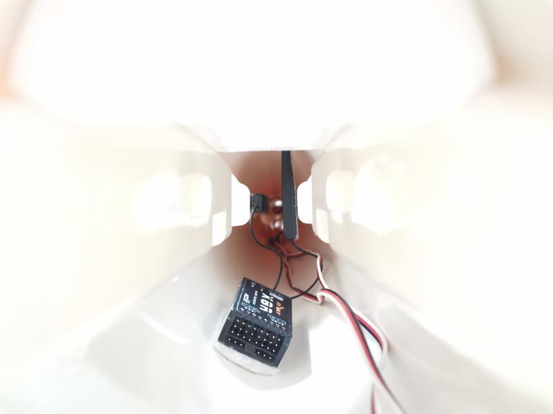 - Вклеил приёмник. Антенны развернул на 90° по отношению друг к другу. Ещё планирую пенопластовую распорку вставить, чтобы они не отвалились. Кстати, очень понравилось решение с вентиояцией. На носу воздухозаборники, а в конце фюзеляжа отверстие. Значит аппаратура всегда будет обдуваться и, соответственно, охлаждаться: