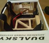 Размах 1650, взлетный вес аппарата 2570, на полном газу - пулей верх. Полезная нагрузка в виде цифрового фотоаппарата на полет заметного влияния не оказывает. Время спокойного полета в треть газа 15 мин. Переделки минимальные - вклеенная в штатную мотораму 6мм фанерная пластина (моторама для БК), ложемент под акки и, соответстно, крышка батарейного отсека с вентиляционной решеткой.
