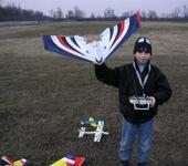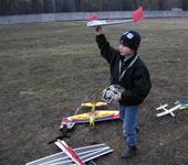 Крыло вот такое - www3.towerhobbies.com/cgi-bin/wti0001p?&I=LXLKP0&P… (профиль - откровенно несущий), моторчик- инраннер, такой - www3.towerhobbies.com/cgi-bin/wti0001p?&I=LXMKH0 (2350kV по данным производителя), воздушный винт АРС 5.25x2.5, урезан до 5" и заново отбалансирован, батарея 1200мАч Lipo 3S1P. Внутрь и по передней кромке вклеены 3мм стекло-прутки. По ходу, центровка немного передняя, если не сказать больше, но с обычной ЛК-акробатикой этот “набор” справлялся без проблем, обладая несколько завышенной устойчивостью (ввиду “тяжелого носа”).