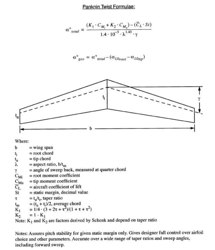 Др. Панкнин описал относительно простой метод определения геометрической крутки для стабилизации ЛК. Он принял, что крутка будет распределена по полуразмаху так, что – корневое сечение будет 0 град, а концевое установлено на некоторый отрицательный угол, и при этом передняя и задняя кромки консоли будут образовывать прямые линии. Крыло Др. Панкнина “Flying Rainbow” использует этот тип распределения крутки.