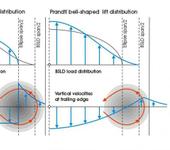 - Скос потока – net downwash. Крыло бесконечного размаха создающее подъемную силу всегда создает скос потока вниз позади больше чем скос потока вверх впереди крыла. Эта разница и есть скос потока создающий подъемную силу. В случае крыла конечного размаха Прандтль математически вывел, что при оптимальной форме крыла с эллиптическим распределением, форма распределения индуктивного скоса потока имеет форму прямоугольника – индуктивный скос потока вдоль размаха постоянен.