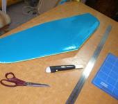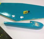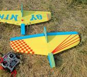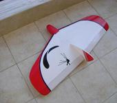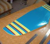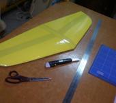 крыло вырезано с пеноплекса - обтянуто скотчем-элевоны бальза обтянуты алюминевым скотчем . Вес 370 грамм. Нос получился куцым- пришлось догружать свинцом , что бы попасть в центровку. Буду переделывать - удлиннять.