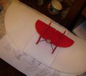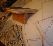 Берем каряку (для справки: каряка- два плоских палена сбитые гвоздями, с наклееным чесалом, торчковые пацаны базар поняли) и по контуру обшивок счесываем по разметке кромку обшивки согласно чертежа (делаем фаску, филлет и.д). Включаем утюг в розетку, и пока нагревается, руками слегка придавливая к острому краю стола гнем, обшивку, до нужной кривизны. Пальцами подгибаем кромку до нужных углов. Шаблонами служат нервюры.