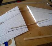 Рейки + потолочка ИМХО тяжеловато получиться… Делал ЛК из такого же обычного пенопласта, но технология “укрепления” использована немного другая, а именно: из бальзы 4мм вырезаны корневые/концевые нервюры, в них сверху и снизу делал пропилы чтобы можно было вложить бамбуковую палочку из расчета 3 штуки с низу, 2 сверху, и по одному на передней и задней кромке. Далее, приклеивал нервюры к пенопластовому ядру, ножом либо струной делал канавки и вклеивал длинные бамбуковые палочки (для этих целей была специально приобретена в ширпотребном магазине китайских товаров бамбуковая шторка шириной 1 метр). Далее, усиленное таким образом ядро обтягивалось пленкой для ламинирования толщиной 70 микрон и красилось обычными красками из балончиков. В результате, вес одной консоли размахом 630 мм вышел около 95-100 грамм (хотя, думаю что отработав технологию можно еще выиграть грамм 10-15). Жесткости на изгиб и кручение - выше крыши. Минусов данной технологии несколько: