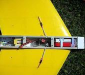 Да, фюзеляж между крыльями. Две досочки из 8 мм бальзы (другой не было) шириной 50 мм, нос скруглён. Склеены перемычками из той же быльзы в четырёх местах (2 сверху и две снизу). Под акком площадка из фанерки. Штыри штатные, проходят насквозь через фюзеляж. Место входа штырей усилено фанерными квадратиками. Для надёжности крепления консолей в корневых нервюрах просверлил дырки и вклеил металлические шпильки М4 и М3 (40 мм) ближе к краю и носу. Они входят в фюзеляж и изнутри притягиваются гайками. Фюзеляж оклеен потолочкой.
