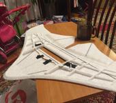 Молодцы. Ближе всех к ответу оказался Сергей (сообщение 1128). Данный вариант появился путём снятия ушек (и больше ни чего) с моего стандартного ЛК (1108). Оно полетело но колбасило во все стороны жутко. Для устойсивости я согнул (по диогонали) элевоны вверх. Своего рода упрощёная крутка. Всё пришло в норму. Хотя как точно пишет Сергей ЛК после манёвров шпгало по голаннски. Сначало это напрягало, а потом понравилось - такая своего рода “изюминка” в пилотировании. Представленный на фото экземпляр был сделан позже, после окончания этих экспериментов. Летал он долго, потом навесил на него светодиоды и летал ночью. В итоге он надоел и был разобран.