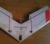 Вот такая нижняя часть. Поставил регулируемые тяги без люфтов, и под сервы вклеил небольшие бальзовые пластины, за счет этого конкретно убрались оставшиеся люфты и управляемость сильно повысилась. Кроме того реально заметный эффект был когда наклеил углепластиковые профиля по элевонам, сверху и снизу. Когда компоновал начинку внутри, проплавлял каналы под провода разогретой отверткой, очень удобно. В носу грузики на эпоксидке. Карбоновый профиль на нижнеи поверхности вклеен дугои, и по передней части на всю длинну. Ц.Т. рассчитан под аккумулятор 1300mh
