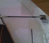 Вот такая нижняя часть. Поставил регулируемые тяги без люфтов, и под сервы вклеил небольшие бальзовые пластины, за счет этого конкретно убрались оставшиеся люфты и управляемость сильно повысилась. Кроме того реально заметный эффект был когда наклеил углепластиковые профиля по элевонам, сверху и снизу. Когда компоновал начинку внутри, проплавлял каналы под провода разогретой отверткой, очень удобно. В носу грузики на эпоксидке. Карбоновый профиль на нижнеи поверхности вклеен дугои, и по передней части на всю длинну. Ц.Т. рассчитан под аккумулятор 1300mh