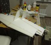 Из материалов все легко доступное, лобики из пенопласта, зашивка и нервюры из потолочки. Лонжероны и кромки - сосна. Эливоны бальза, можно было и из потолочки… Две 9г. машинки.