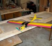 На одном крыле из бальзы 3мм, на другом из пенопласта 5мм. Торец (полка) пенопластовой нервюрки мажется ПВАшкой, 8 оборотов ниткой и снова ПВА. Получается жеская,лекгая и прочная нервюрка которая затем мажется прозрачным Моментом под пленку. Центральная нервюра наборная и 5-6 шт, зашивается 1мм бальзой. Можно конечно все нервюры бальзой1мм или фанерой 0,4мм зашить,но детские руки кривовато эту операцию делают, так что ниткой им проще