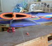 Сделал экспериментальную пилотажку под ОС МАКС 25 ЛА. Вся из бальзы толщ. 1,5 в том числе и шпангоуты рамы (переклей 3 слоя). Весит 760 гр. Регулируются все соотношения систем управления. Сам не летаю, сделал для наших мастеров, чтобы выявлять те или иные тенденции. Летает на 19 м кордах, винт “Аиркревс 9х5”, нитрометан 5%. Комплекс вытягивает без проблем. Что на ней удалось выяснить, то, что разным пилотажникам нужна разная настройка. Оканчательные выводы делать рано.