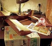 У нее переменный мидель по всей длине крыла (неа,- не трапеция), но не как рубанок ляжет, а немножко сложнее. Каждая нервюра индивидуальная (а не та, что получается между двумя зажатыми в тиски профилями из фанеры или дюраля. Управление качалками наизнанку. Отклонение рулей посредством плечей, под особенности моего сына с переменным радиусом. На радио это называется - экспонента. Есть еще и нечувствительность рулей. Сейчас это в радио называется - мертвой зоной. Очень сложно было добиться экспаненты и мертвой зоны на прямом управлении.