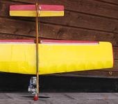 В процессе множества падений и поломок, самолет уже наполовину состоит из стекла и смолы. Отсюда зашкаливающий вес, но центровка в результате в норме, т.к. пришлось стаб затягивать в стекло.
