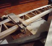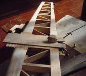Здравствуйте все. Попробую продолжить начатое(пост 624). Стабилизотор крепится в фюзеляже одним винтом м3 и фиксируется шипом диам.3мм(бамбук, да здравствуют товарищи китайцы). Эту систему я увидел когда-то у Андрея Яценко(класика-2). Сначала нужно сделать ложемент, центральную часть стабилизатора защищаем чем -нибудь(скотч,лавсан) и создаем не-кую конструкцию, охватывающую этот самый стабилизатор. Стеклоткань, эпокс., пластинки бальзы. В районе передней кромки нужно сделать какой-то массив, в него в последствии заходит шип( я применил переклейку бальза-фанера).Когда смола застынет, сверлим насквозь этот массив и переднюю кромку стабилизатора. Теперь стабилизатор вынимаем и можно вклеить бамбуковый шип. Плотность посадки доводится круглым надфилем.Далее на ложементе крепим бобышку, несущую гайку м3, а на стабилизаторе-ушко с отверстием 3мм, соединение выполнено. Весь узел в сборе потом клеится на фюзеляже. Фото другого самолета, но принцип тот же