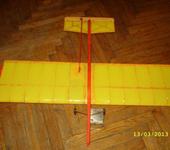 Ну и как у всех пионеров, в наборе чего-то не хватало, что-то переделал ни как на чертеже , и возник ряд вопросов… собрал модель как на исправленном эскизе. Концовок крыла в наборе не было,изготовил из пенопласта. Еще пенопласт использовал в месте выхода рулевой тяги, все это правильно? На сколько страшен новый ,измененный стабилизатор? Руль высоты отклоняется на 14град. максимум, этого достаточно для первого полета? Свинцовый грузик в наборе весил 7,4гр , по инструкции в крыло крепят 15-20ти грамовый груз , пришлось вылить на 20гр и закрепить на концевой нервюре. А вот с САХом,признаюсь честно, туплю. Как провести операцию по расчету и уравновешиванию масс на модели (по инструкции- 15-20% от носка хорды) ? Работа корд получилась не с подручной, потянув за переднюю корду,руль отводится вниз, а по логике,хотелось бы, чтобы первая корда поворачивала руль вверх,а задняя - вниз.На сколько это критично? Спасибо.