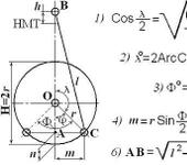 Н - ход поршня от НМТ до верхней кромки окна, (размер поршня от торца до оси пальца не обозначен, так как никак не влияет на рассчет). На выходе косинус половины угла поворота вала > угол = 2 * arccos (“альфа/2”)…