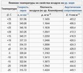 В этой таблице не хватает двух столбиков. 1. Относительная влажность воздуха; 2. Номер испытанного ВВ. Скорость звука и аккустическое сопротивлене для ВВ не важно, а номограмма зависимости плотности воздуха от высоты, температуры и влажности необходимо. Готовых решений я не встречал в литературе, хотя сам имел и у других видел. Это частные наработки с привязкой к реальному ВВ, как результат большого кол-ва тренировок с фиксацией всех парметров.