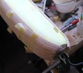 Основная ошибка допущена на этапе, описанном в посте 208. Нужно было после того, как закончена эта обечайка, хорошенько ее проэмалитить, пошкурить, где нужно зашпаклевать щели тальком, короче довести поверхность до идеала, я этого не сделал, а сразу наложил стеклоткань. В итоге смола ушла в щели между рейками, это обнаружилось после, когда шкурил с водой после грунтовки, появились дыры, много, пришлось их шпаклевать, ямы и уступы, тоже шпаклевка.