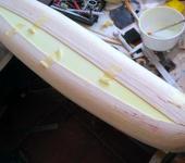Основная ошибка допущена на этапе, описанном в посте 208. Нужно было после того, как закончена эта обечайка, хорошенько ее проэмалитить, пошкурить, где нужно зашпаклевать щели тальком, короче довести поверхность до идеала, я этого не сделал, а сразу наложил стеклоткань. В итоге смола ушла в щели между рейками, это обнаружилось после, когда шкурил с водой после грунтовки, появились дыры, много, пришлось их шпаклевать, ямы и уступы, тоже шпаклевка.