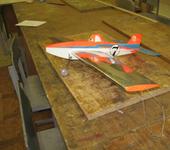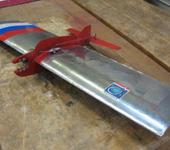 Третей моделью стал “Мустанг”. Так как пропорции модели попытался приблизить к копийным, стабилизатор получился небольшим и недостаток площади компенсировал на крыле. При том же размахе, как и на первых моделях, хорда у корня получилась 180 мм, толщина - 18. Крыло, как и на “Дасти” выполнено по “бойцовой” технологии. На первой и второй модели передняя кромка прямая, здесь - скошенная. Качалка в крыле. Модель хорошо зарекомендовала себя - 2-е место в Тольятти в прошлом году.