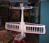 Доброго всем здоровьичка! Хвастаться мне конечно рано. Но разговор поддержать желаю. Подошел вплотную к отделке. Как вспомню (представлю), так вздрогну, что меня ждет. Пока что самолет в таком виде. По ходу пьесы возник вопрос о материале для стоек шасси. Предполагалось сделать стойки на фюзеляже. Вот хоть тресни, а нет листового дюраля под рукой. Лазить искать, неохота. Принял решение сделать стойки в крыле. При таком решении можно обойтись стальной проволокой. В крылья вклеил узлы крепления. Уже потихонечку приступил к отделке. Вес набирается стремительно.